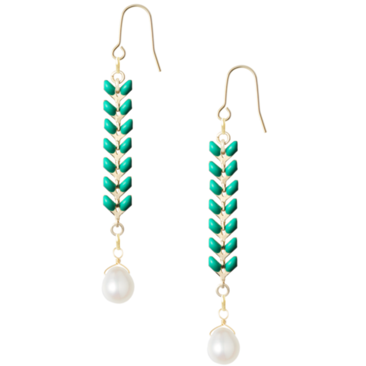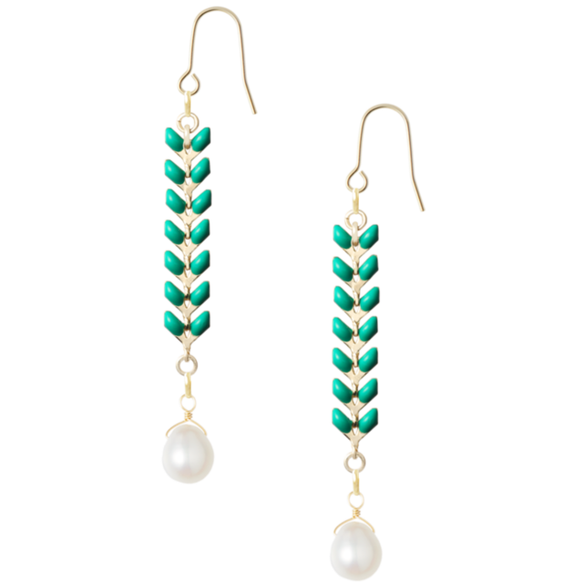 ・ピアスには、厳選された淡水パールとグリーンリーフチェーンを使用し、製造国は日本です。熟練した職人の手によって丁寧に仕上げられており、高品質な素材が自慢です。