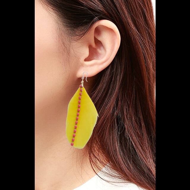 ・このピアスは、マスタード色の羽とピンクチェーンのコンビネーションがどのファッションにも調和しやすく、サイズはフリーで多くの方にお楽しみいただけるよう設計されています。