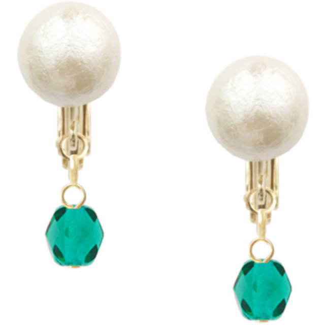 ・このイヤリングは、コットンパールのネジばねとエメラルドのチェコビーズの組み合わせが特長で、多様なファッションに調和しやすく、サイズはフリーで多くの方にお楽しみいただけるよう設計されています。