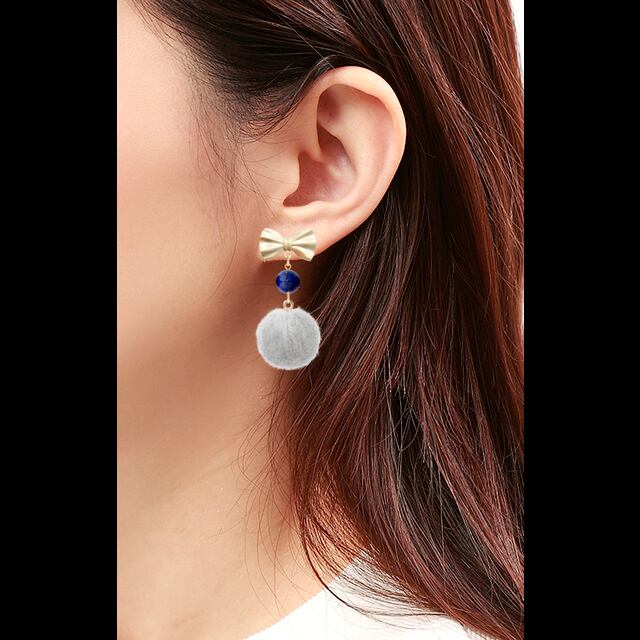 洗練されたデザインが魅力のこのエレガントなピアスは、大きなリボンとエコファーボール、天然石ラピスを組み合わせた美しい作品です。耳元に遊び心と華やかさをプラスすること間違いなし!