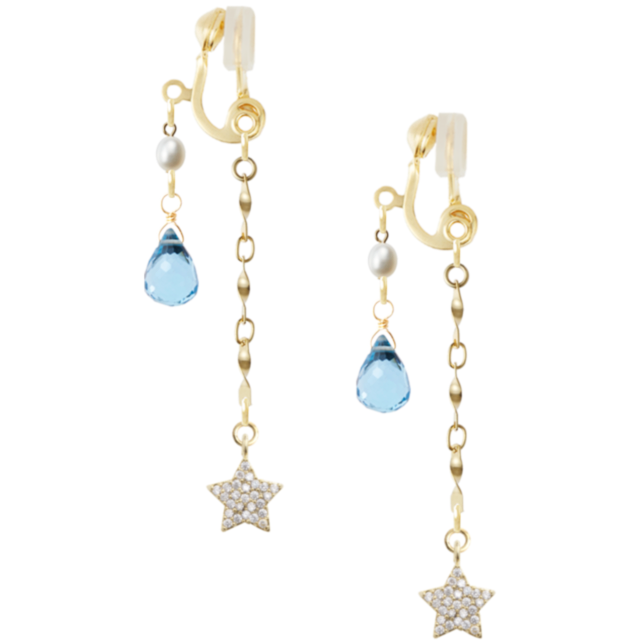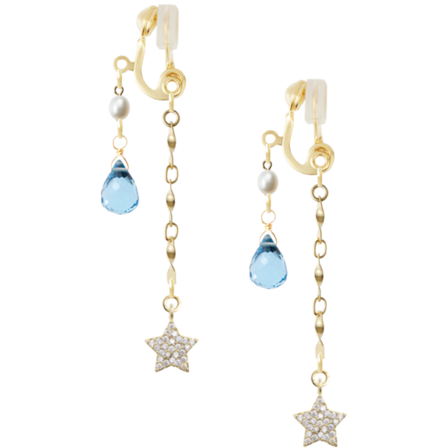 ・イヤリングには、厳選されたブルートパーズ、淡水パール、スターパヴェパーツを使用しており、製造国は日本です。熟練の職人による丁寧な仕上がりが、デザインの魅力を一層引き立てます。