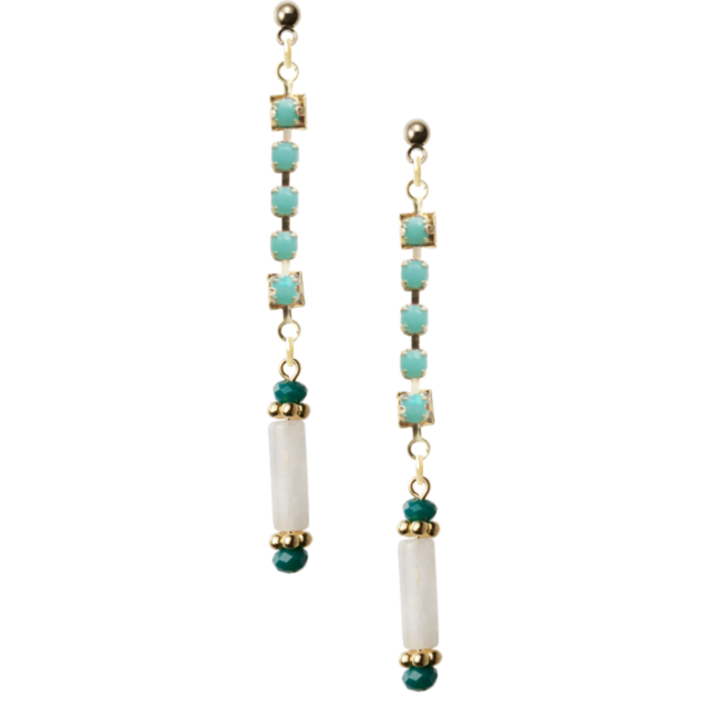 シンプルでありながら存在感のあるデザインが際立つこのエレガントなピアスは、丸玉のピアスとアクリルチェーンターコイズ、そして魅力的なローズクォーツのストーン付きパーツが組み合わさった美しい作品です。耳元に洗練された華やかさをプラスします!