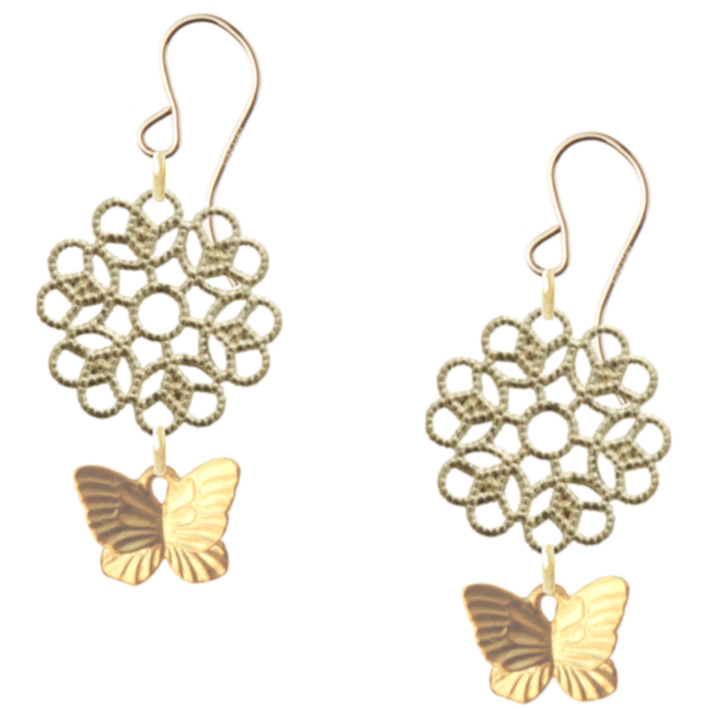 ナチュラルなテイストが魅力の「Fleur Charmant」ピアス。14KGFのフックピアスが耳元に優しく寄り添い、透かしパーツの花六弁と、愛らしい蝶のデザインが華やかな印象を与えます!カジュアルな日常使いから特別なシーンまで、幅広く楽しめるアイテムです。