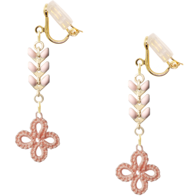 優雅でありながらもシンプルに楽しめる「Fleur Charmant」のイヤリング。三角バネ玉プライヤリングに、リーフチェーンとタティングパーツのベビーピンクが耳元に特別な魅力をプラスし、カジュアルからフォーマルまで幅広くお楽しみいただけるアイテムです!