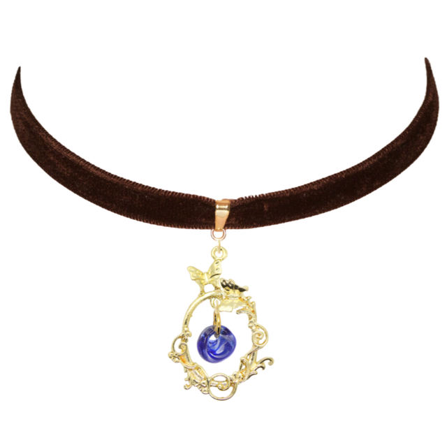 ・このネックレスはダークブラウンのベルベットチョーカーと蝶のリースチャーム、ティアドロップ型のブルーガラスビーズが絶妙に調和し、首元に特別な魅力をもたらします。