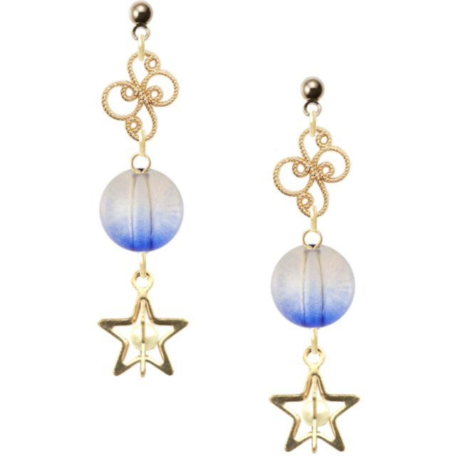 独自のデザインと優雅な魅力で、あなたのスタイルを一層引き立てる「Fleur Charmant」のピアス。特徴的な丸玉のピアスに、アラベスクメタルパーツ、さらに樹脂ヴィトライユのグラデーション丸玉(ブルー×ブラウン)と立体スターのパールが絶妙に調和し、耳元を華やかに彩ります。日常のおしゃれから特別なシーンまで、幅広く楽しむことができるアイテムです!