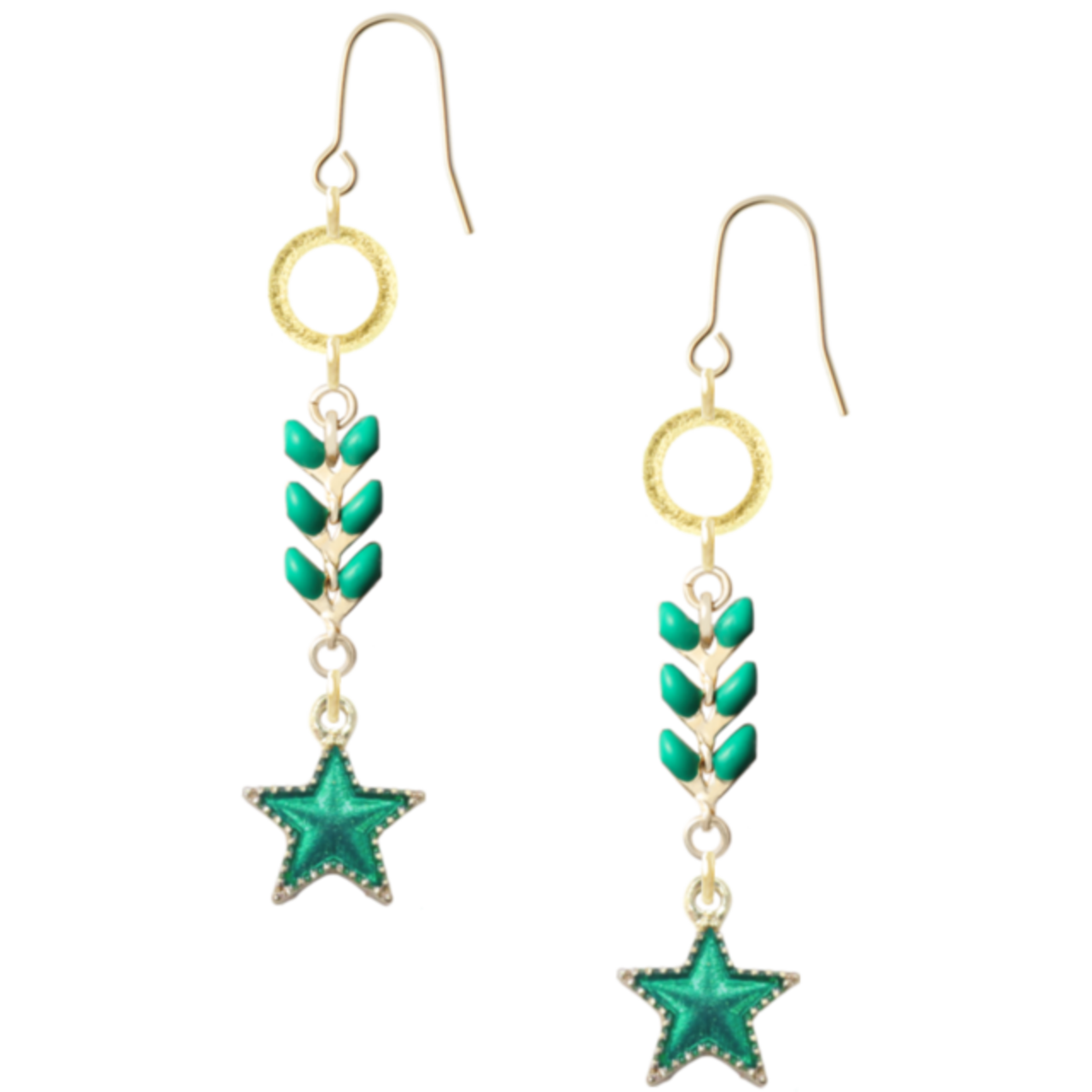 ・このピアスは、カラー星グリーンのリーフチェーンと煌めくスターダストの丸カンが組み合わさり、耳元に特別な魅力をもたらします。